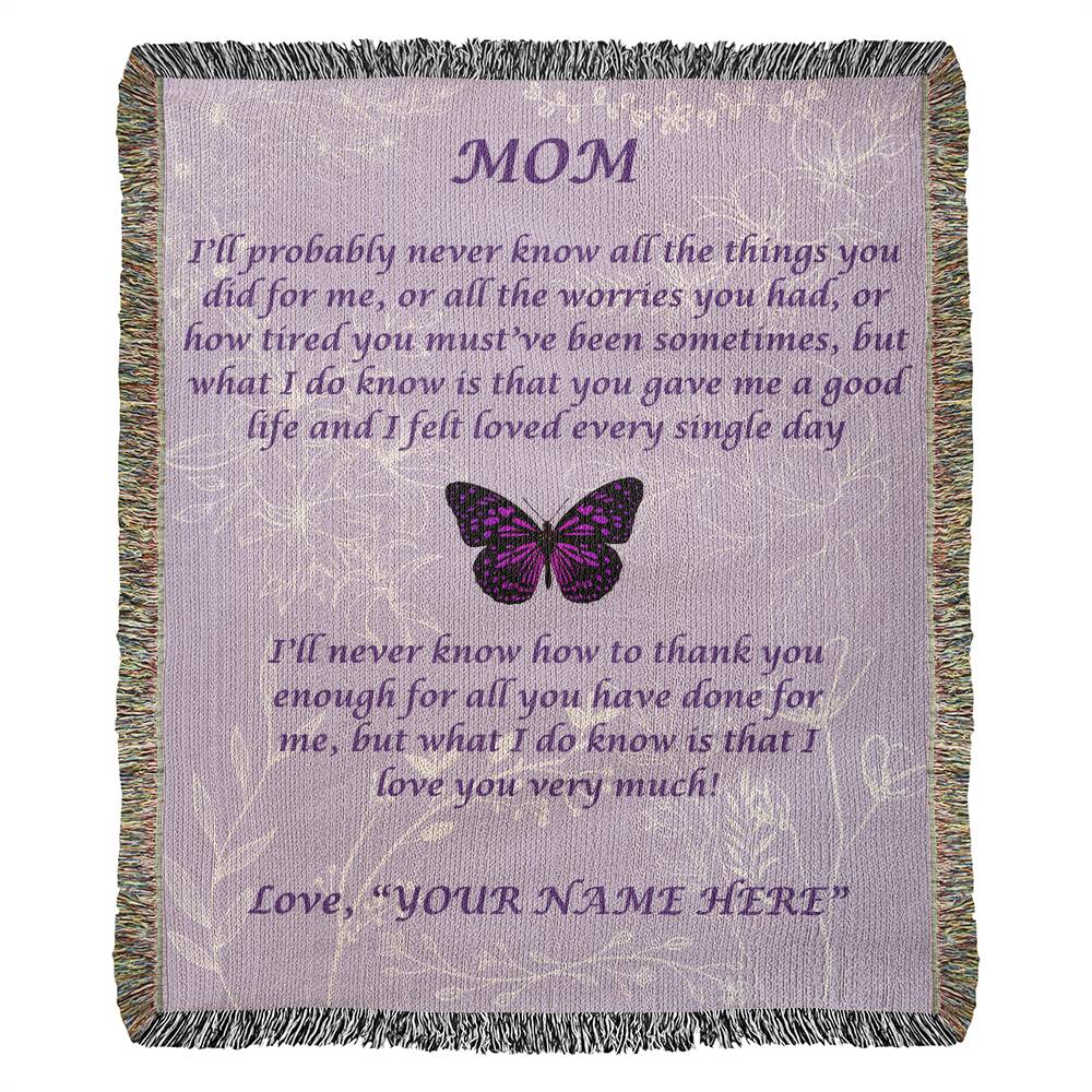 Create a unique keepsake with our Heirloom Woven Blanket. This piece is lovingly weaved on a loom with cozy, 100% cotton yarn and features your unique design. This would make an ideal gift for your beloved partner, family members, or dear friends on special occasions like birthdays, anniversaries, or any event where you want to express your love and appreciation in an unforgettable way.